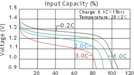 At 20±2°C, it can be discharged continuously at 0.2C rate to 1.0V cut-off, or quick discharged continuously at 3Crate to 0.9V.